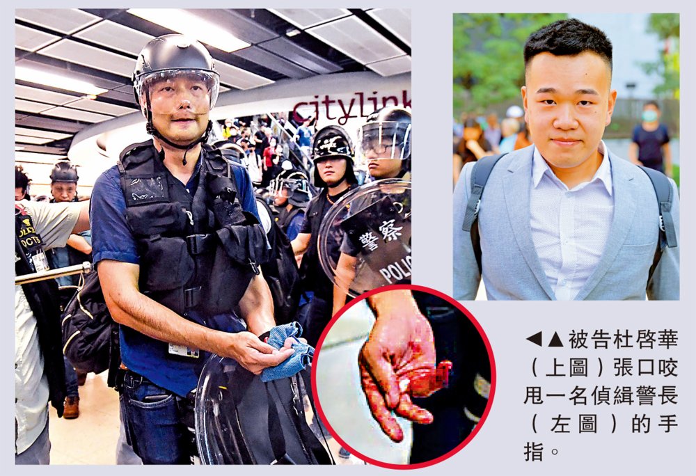 被告杜啟華(24歲)早前被裁定在公眾地方內擾亂秩序、襲警、對他人身體加以嚴重傷害及蓄意傷人共四罪成立。當中的蓄意傷人罪,牽涉杜將一名梁姓偵緝警長的右手無名指末端,咬成粉碎性骨折。梁需接受斷指再植手術,但無名指至今只能康復七成。