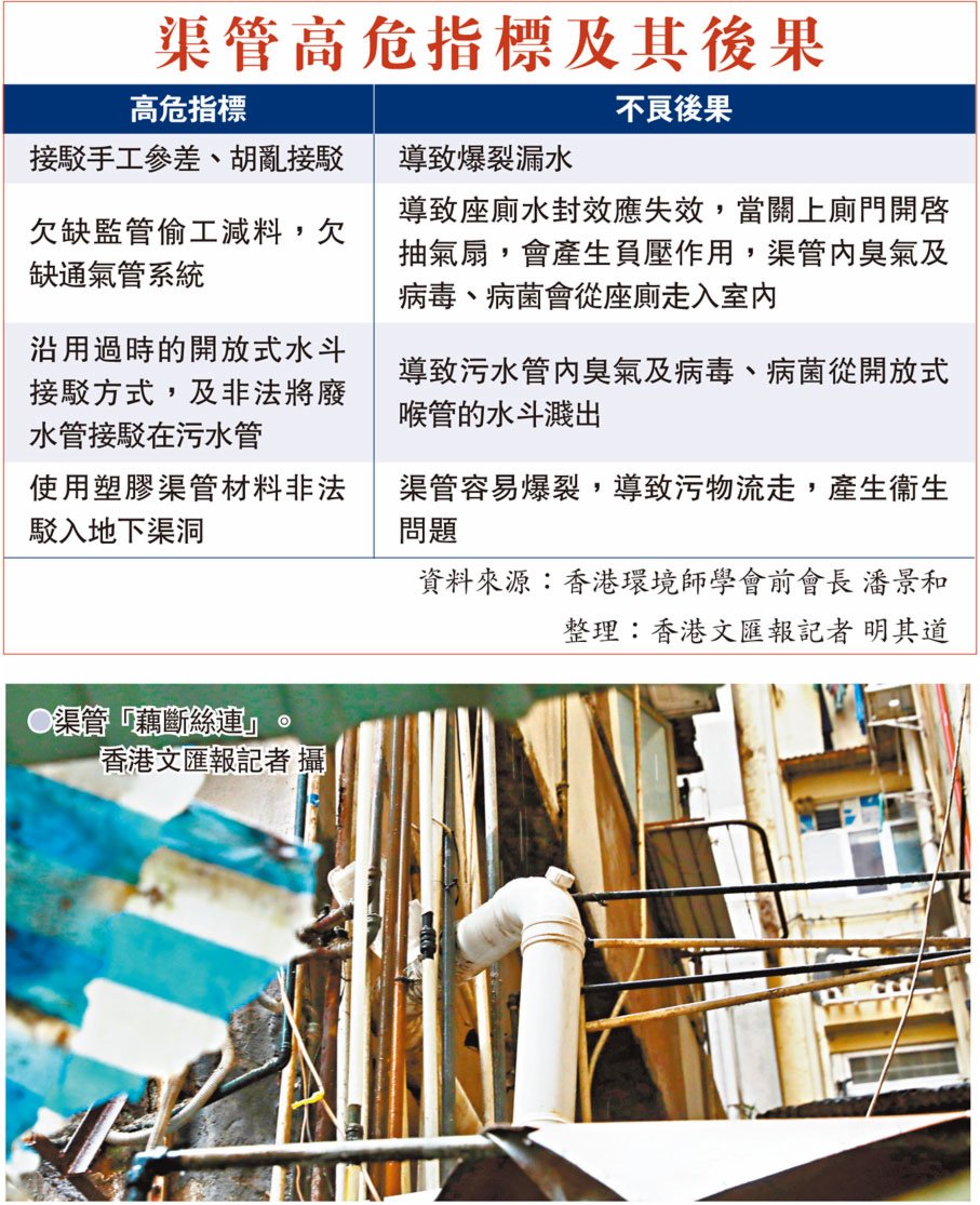 (香港文匯報 記者 明其道)新冠肺炎疫情持續,大廈渠管狀況備受關注,特區政府在新一份財政預算案建議資助舊樓業主為大廈渠管進行檢查、維修。香港文匯報記者日前與渠管專家走訪深水埗區,眼見舊樓的渠管問題亂象叢生,最誇張的是一幢有法團組織的大廈,被旁邊三無大廈以「飛象過河」方式搭渠,以致法團大廈渠爆不斷。專家初步估算,該大廈若獲政府最多八成工程費資助,每戶業主只需夾5,000元,惟香港缺乏專業渠匠、承辦商質素參差,加上政府監管不力,政府資助大廈改善排水系統的計劃隨時步早年「樓宇更新」等計劃的後塵,養肥了圍標集團,卻幫不到業主居民解決渠管「播疫」隱患。