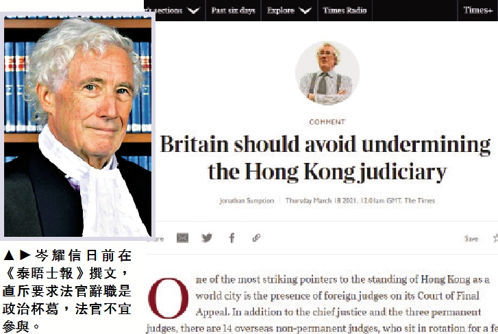 自從中央通過香港國安法及完善香港選舉制度決定後,英國政客及媒體不斷興風作浪。《泰晤士報》社論近日要求終審法院的所有英籍法官辭職,以示不滿全國人大的決定。終審法院非常任法官、英國最高法院院長韋彥德,日前出席英國國會最高法院年度聽證會時,聲稱假如有違良知,就不會留任云云。