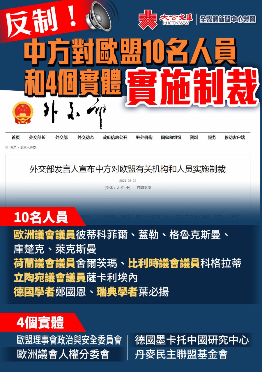 中國政府捍衛國家主權、安全、發展利益的決心堅定不移。中方決定對歐方嚴重損害中方主權和利益、惡意傳播謊言和虛假信息的10名人員和4個實體實施制裁,包括:歐洲議會議員彼蒂科菲爾、蓋勒、格魯克斯曼、庫楚克、萊克斯曼,荷蘭議會議員舍爾茨瑪,比利時議會議員科格拉蒂,立陶宛議會議員薩卡利埃內,德國學者鄭國恩,瑞典學者葉必揚,歐盟理事會政治與安全委員會,歐洲議會人權分委會,德國墨卡托中國研究中心,丹麥民主聯盟基金會。相關人員及其家屬被禁止入境中國內地及香港、澳門特別行政區,他們及其關聯企業、機構也已被限制同中國進行往來。