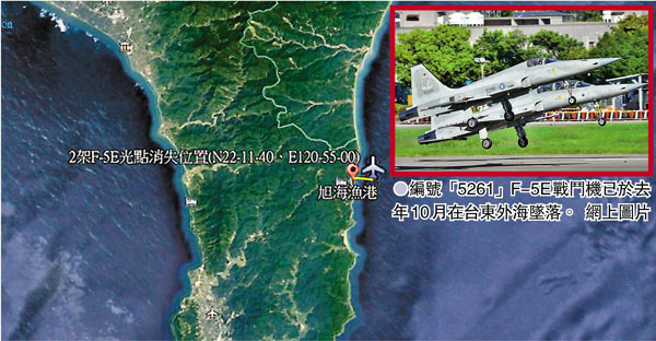 據報道,台防務部門4架F-5E戰機22日下午2時30分從台東志航基地起飛執行訓練任務,下午3時6分其中2架戰機雷達光點消失在屏東外海。台灣防務部門通報,2架戰機在空中發生擦撞後墜海,2名飛行員已跳傘逃生。搜救直升機當日下午4時41分在海上發現其中一名飛行員,救起時已失去意識,送醫急救後仍宣告不治,另一名飛行員仍失聯,持續搜尋中。
