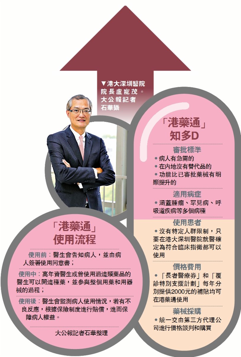 「我們從臨床角度出發,病人有急需的、在內地沒有替代品,或功能比現在已經審批的藥械有明顯提升的,幫到更多病人的。」談及「港藥通」的標準,港大深圳醫院院長盧寵茂表示臨床需要是唯一決定因素,他還表示:「我們也在考慮優化整個流程,從採購、定價、運送、過關、報稅,到藥品真正的使用,病人的知情同意,不良事件監控等。目前已經到最後的階段,希望盡快能落地。」