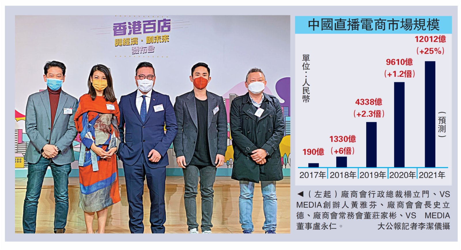 (大公報記者 李潔儀)在內地盛行的直播帶貨電商模式,近年亦在香港市場興起。面對零售環境的轉變,加速港商發展內銷業務,香港中華廠商聯合會(簡稱:廠商會)旗下「CMA良倉」夥拍網紅媒體VS media等推出《香港百店》跨境電商項目,利用藝人和網紅做直播帶貨,協助香港中小企打進內銷市場。
