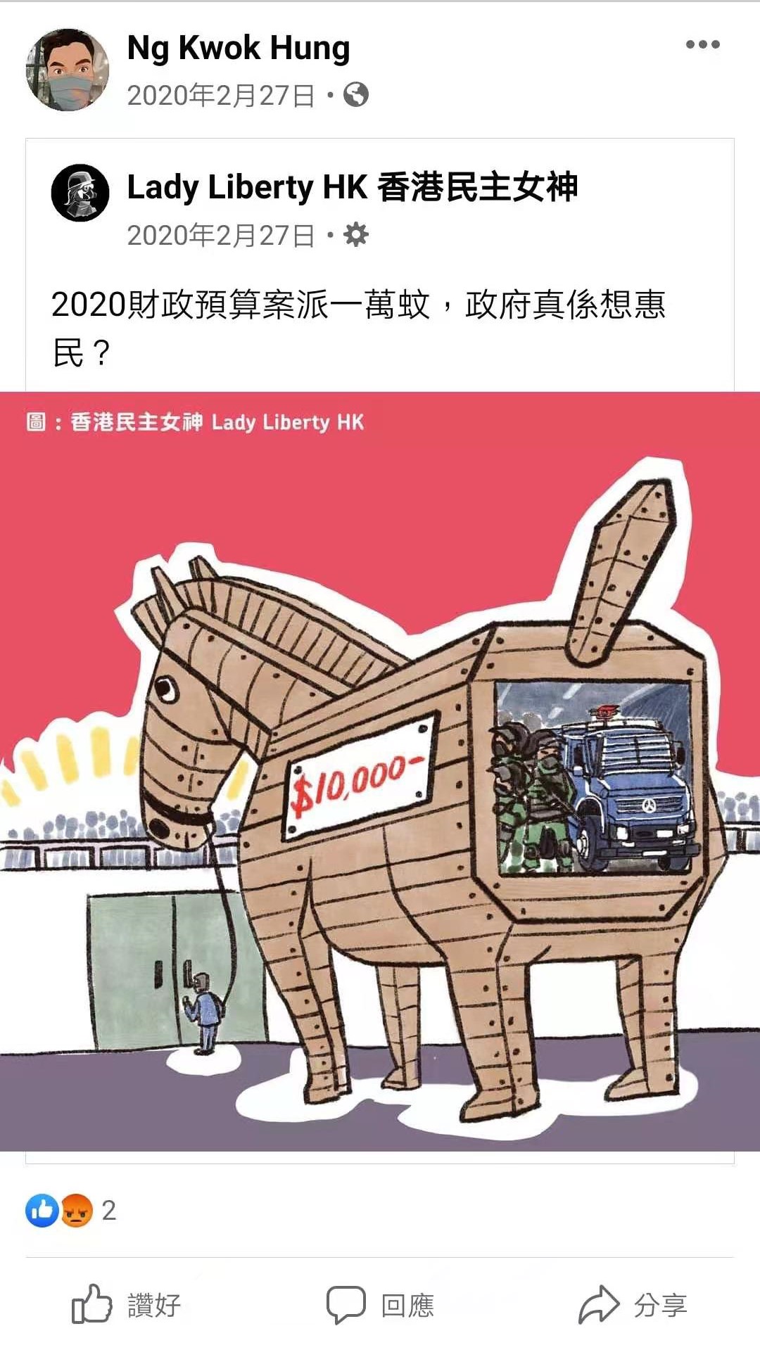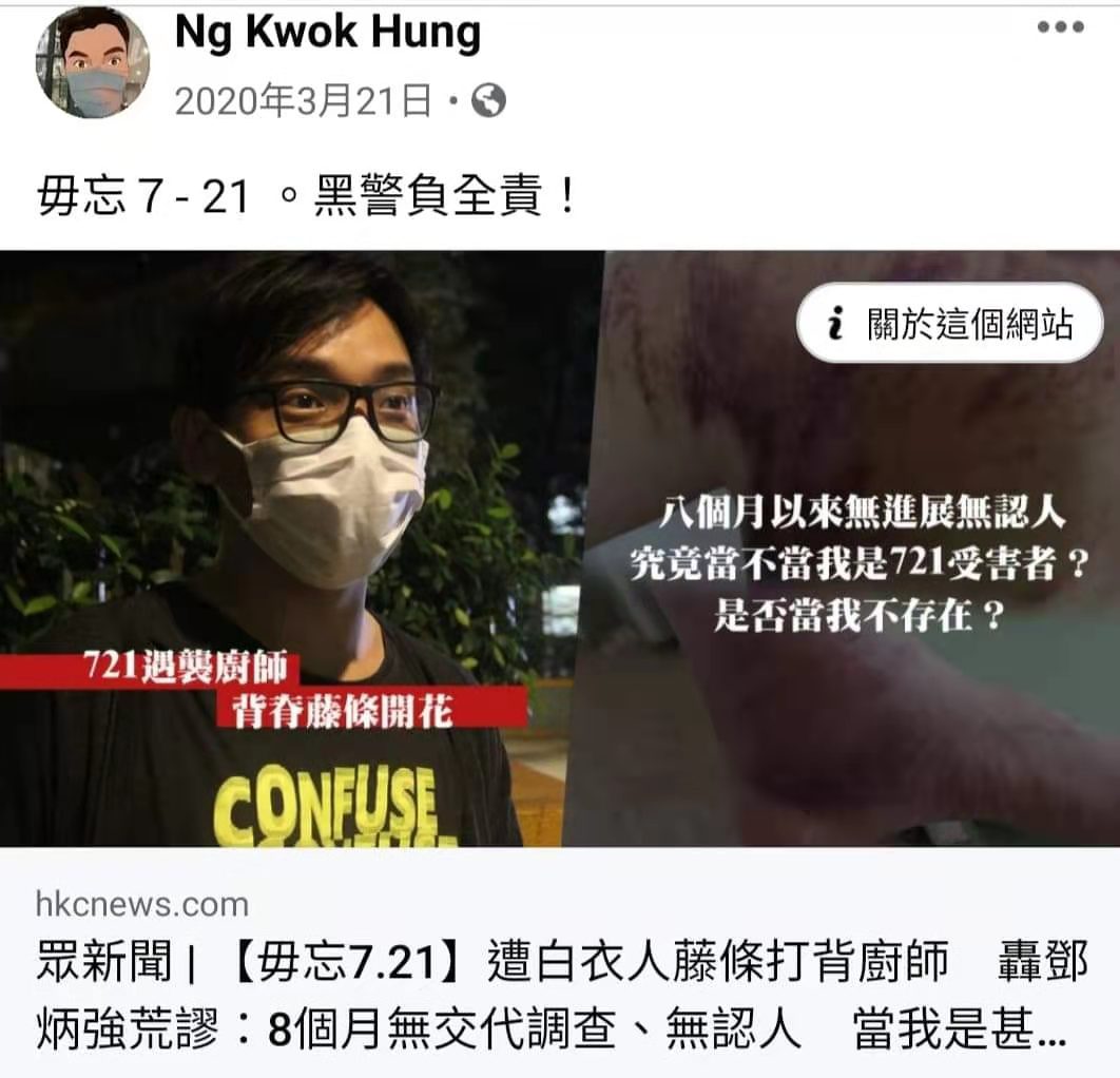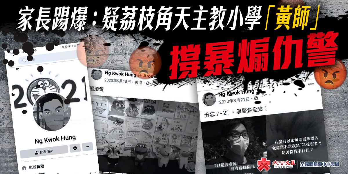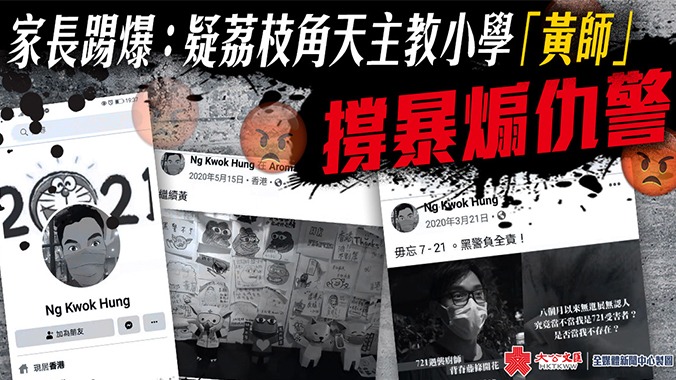 爆料家長指,疑似荔枝角天主教小學教師吳國雄在其個人賬號「Ng kwok hung」,自修例風波期間,在個人fb賬號經常發表激進政治言論,包括轉發各種仇警內容,例如「721」、「831」等事件,抹黑政府財政預算案,亦有支持黑醫護罷工,購買支持黑暴的「積木革命」公仔,甚至出現手拿「香港人反抗」文宣的照片,令人側目。該賬號被人揭發後,隨即刪除有關帖文,企圖掩蓋其「播獨」行徑。