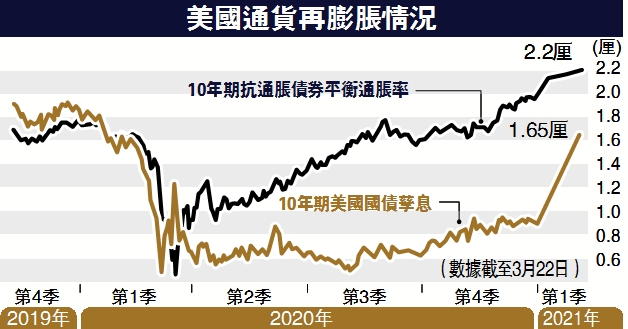 在經濟復甦期望日高之際,華爾街大行已關注通貨再膨脹交易(Reflation trade)的前景。在這種交易的環境下,對通脹升溫和經濟增長較為敏感的資產價格,其表現往往相對較佳,相反地,對通脹預期較敏感的資產,例如債券等,其價格則不斷下跌,孳息則持續上升。