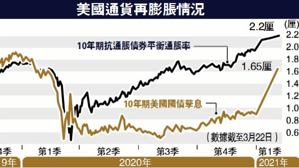 美國經濟的確已從去年中的谷底逐步反彈,失業率已由去年5月份曾錄得的15%,大幅降至近日的6.3%。其中一個原因是聯儲局自從疫情大爆發後,便即時把利率調低至歷來最低水平,並不停地大規模向經濟體系泵水。另一方面,美國國會亦在早前通過了數以萬億美元計的經濟刺激方案,令人相信,當疫情放緩,經濟復甦步伐加速,便會刺激起消費者的購物意欲,和企業的招聘意向。同時,美國目前已有數百萬人接種了新冠疫苗,這亦為未來復甦打了一支強心針。