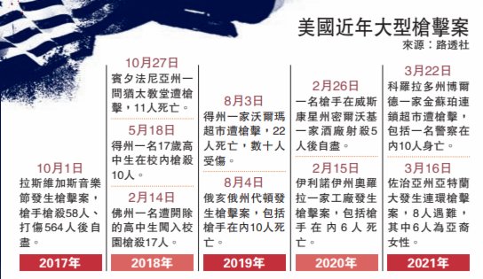 「槍支暴力檔案」將除兇手外死傷人數超過4人的槍擊案定義為「大型槍擊案」。在此標準下,美國2018年發生336宗大型槍擊案,2019年升至417宗,2020年更激增至611宗。過去一周,亞特蘭大和博爾德先後發生慘案,累計死亡人數達到18人,震驚國際社會。有分析認為,疫情期間美國社會的貧富鴻溝、種族對立、政治分歧均被放大,極化現象越來越嚴重,由此引發的暴力事件恐不斷增多。