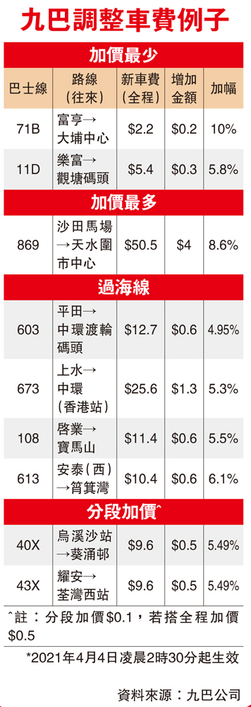 (大公報記者 譚鳴)四間巴士公司早前成功爭取逆市加價,四月四日起分階段生效,九巴昨日公布新車費,車程愈遠加得愈多。若以過海線673為例,每程多付1.3元,新車費25.6元;加得最誇張的是869線,每程加4元,新車費50.5元,來回走一轉,已唔見咗一張「紅衫魚」。