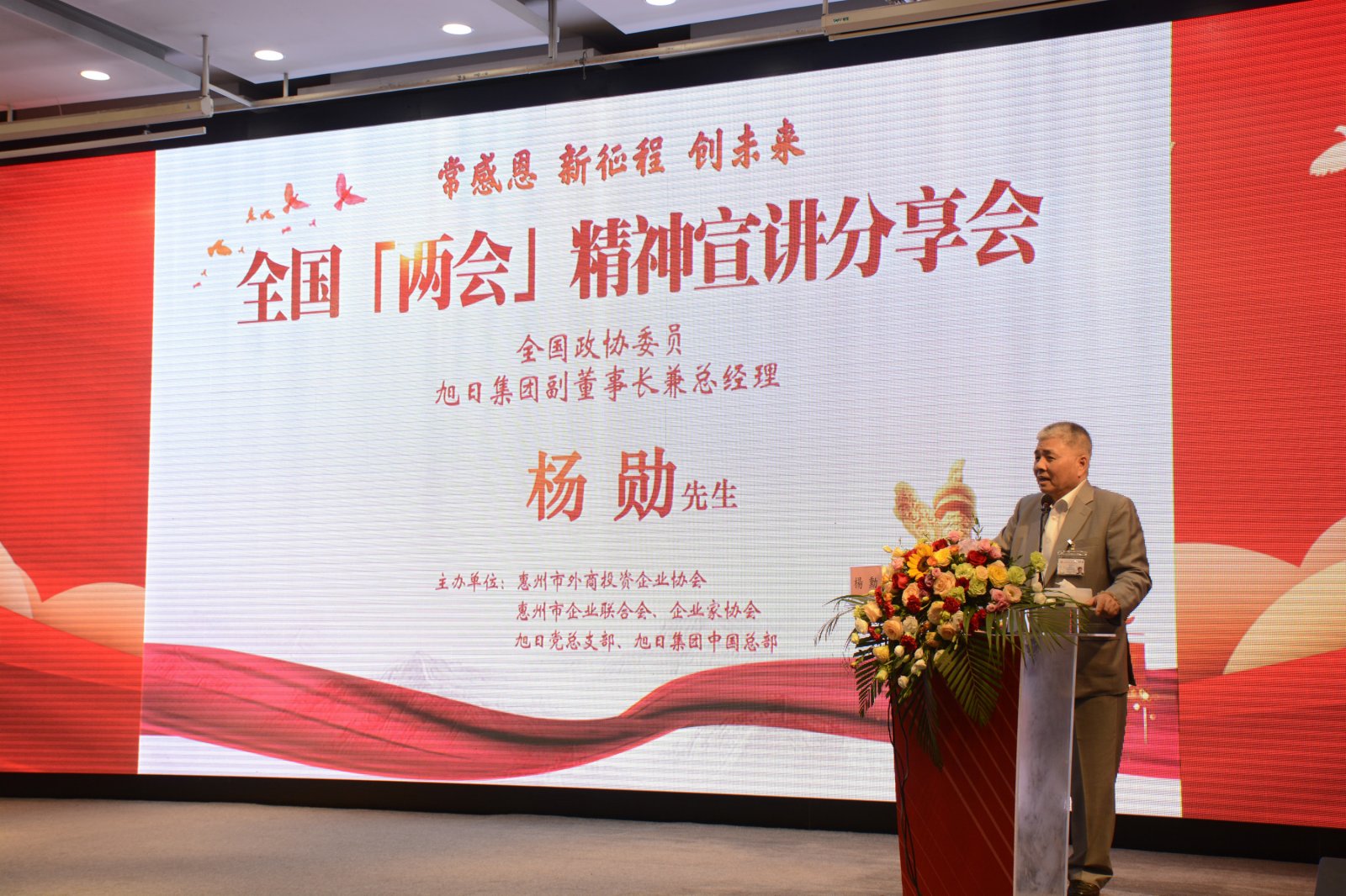 大文新聞網報道,2021年3月19日,全國政協委員、旭日集團副董事長兼總經理楊勛展開「兩會精神」宣講分享,向公司員工以及社會各界人士宣傳兩會精神。本次分享於旭日集團中國總部舉行,活動由旭日集團副董事長楊勛主持。出席分享會的包括惠州市工業和信息化局、惠城區科工信局、外商投資企業協會、惠州市企業聯合會、惠州市企業家協會、惠州市佛教協會、民生銀行等,政府、協會、企業單位的領導及嘉賓。同時,分享會以網上直播形式開展,旭日集團香港總部及河北石家莊常宏建築裝飾工程有限公司員工線上參與。