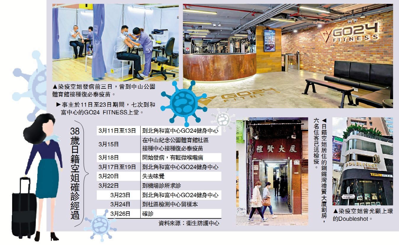 (大公報 記者 陳咏韶)本港新冠肺炎疫情的無源頭確診個案,前日清零一日即「斷纜」,昨日新增確診的38歲日籍空姐,屬無源頭個案,發病前三日曾接種復必泰疫苗,傳染期曾經七次到北角的GO24 FITNESS健身中心做運動,20多名學員和導師須檢疫。