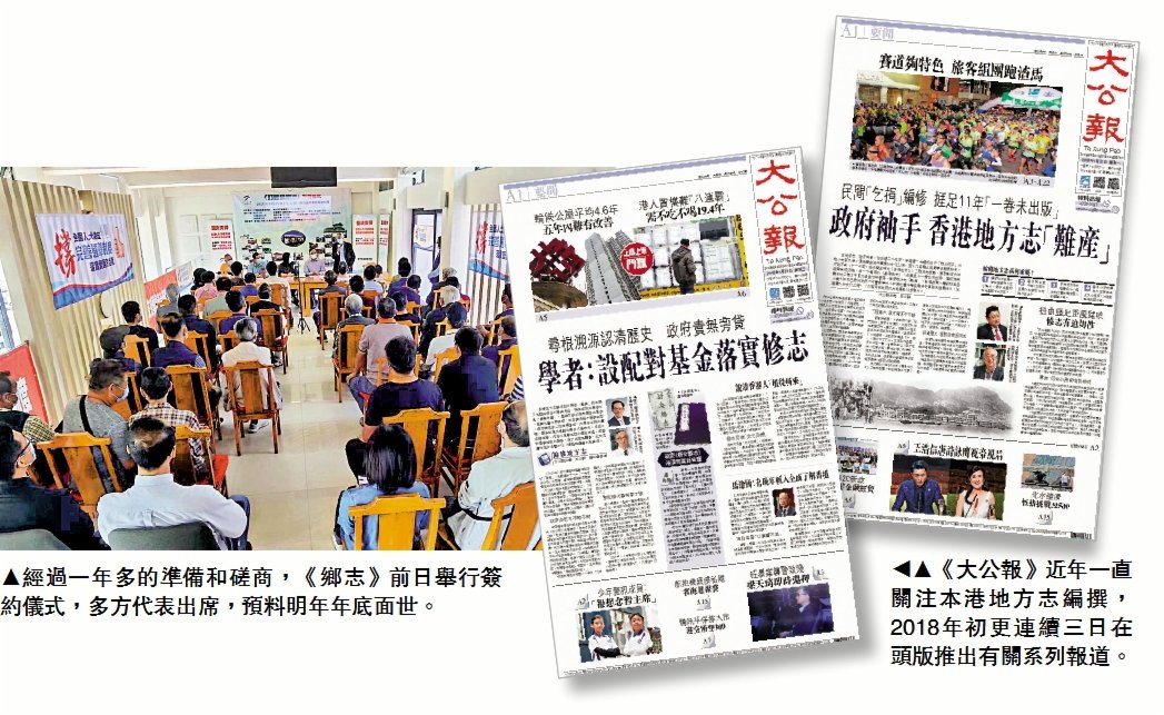 《大公報》近年一直關注本港地方志編撰,2018年初更連續三日在頭版推出有關系列報道。香港地方志中心去年底出版首冊地方志《總述‧大事記》,整部誌書共設10個部類,涵蓋自然、文化、經濟等範疇,共42分冊分階段出版,預計將於2027年完成。劉蜀永說,鄉志、村志和地方志一樣,本質上都是「尋根」工程,均有利於增強港人的文化認同,希望第一本鄉志能促進香港構建全方位的地方志編修系統。