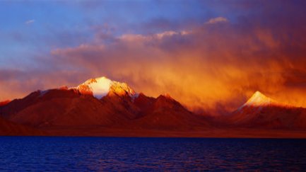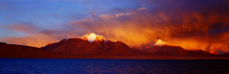 傍晚我們到了一個叫甜水海的地方,這個時候車上的油燈已亮了,在我們的右手邊有一座不高的雪山,雪山下面是一個美麗的小湖。我讓停下車,又看看天空,覺得當天晚上應該有機會拍到美景。然後我們把車開到湖邊,支好兩個三腳架,裝上兩台林好夫617相機,一隻90mm鏡頭、一隻180mm鏡頭,等待落日前那黃金一刻。