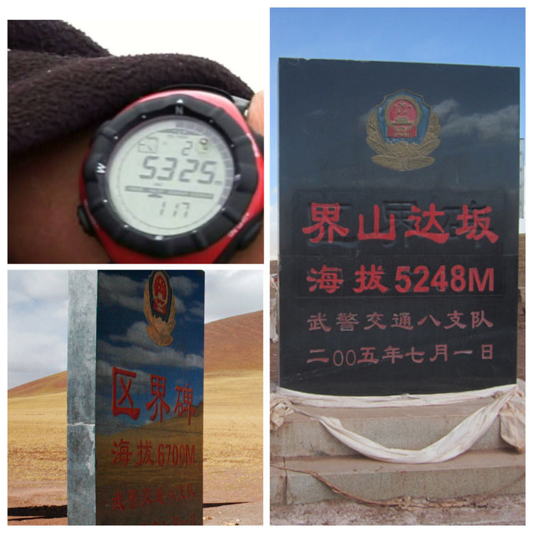 從阿里到新疆的葉城大約有1000多公里,途中沒有加油站。我們在阿里日土縣雖然給汽車和備用油桶都加滿了油,但心裏還是非常忐忑不安--因為我們要經過號稱海拔6700米的界山達阪,我們的團隊人員和車輛能不能經受住這麼高海拔的考驗,心裏沒有數!在翻越界山達阪時我們的一輛車明顯爬坡無力,到海拔4700米以上全是白茫茫的雪,人也昏昏沉沉的只想睡覺,加上新疆來的黃建國和蘭斌很肯定的告訴我們界山達阪的海拔高度是6700米,需要氧氣罐支撐才好保持頭腦清醒,心裏有些小緊張。我們的汽車吭哧吭哧爬到海拔5100多米的一個達阪的埡口時,看了看並不是界山達阪,但是埡口白茫茫的全是雪,我們還是決定下車照相做個留念。隨後汽車繼續艱難的往下一個達阪爬行。當我手腕上的海拔表顯示到5200的高度時,終於看到路邊的指示牌上顯示前方即將到達海拔6700米的界山達阪。按照我的海拔表高度,我們的汽車應該還得艱苦的再爬行一段,但是目測看上去已經不是太遠了。我開始懷疑是不是我的海拔表失靈了?但目測的距離沒錯--我們已經到達界山達阪(這是我們全部行程中翻越最高的一個達阪)。我們停下車來照相留念,記錄我們翻越這一程的最高海拔6700米。可是我的海拔表卻顯示那裏只有5325米!