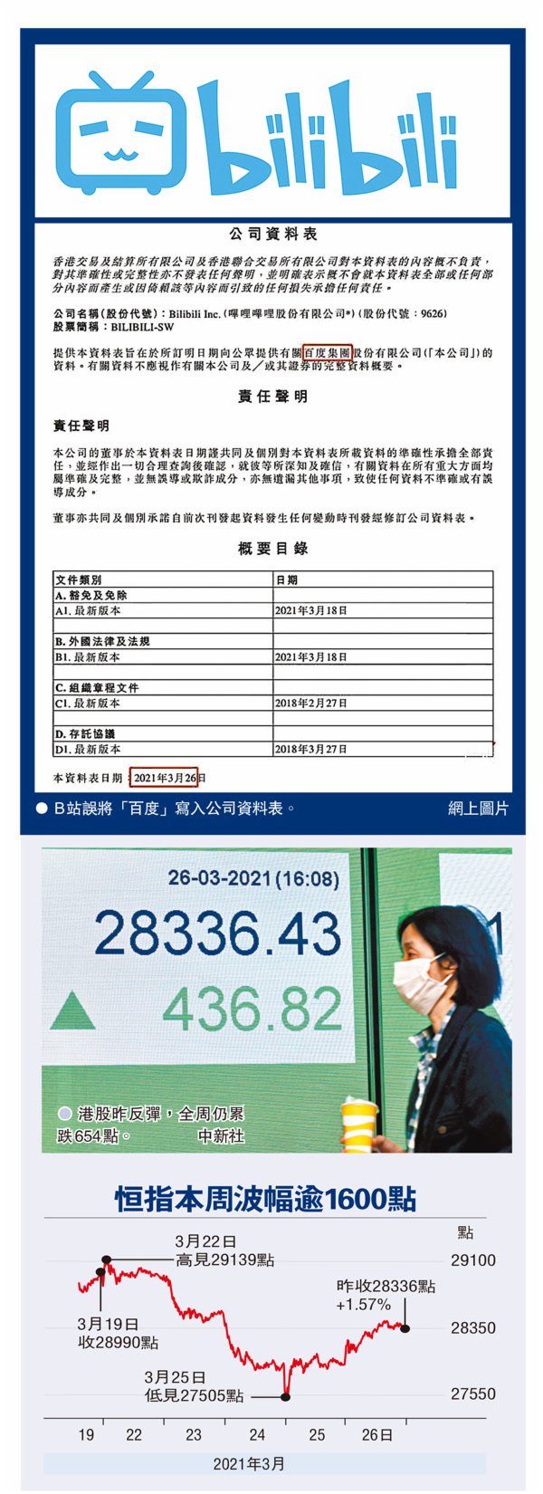 此外,屋漏偏逢連夜雨。B站周五早上在聯交所上載「公司資料表」中,內文錯把公司名稱寫成剛上市的百度(9888) 。該資料表其中有一句「提供本資料表旨在於所訂明日期,向公眾提供有關百度集團股份有限公司(「本公司」)的資料」出現疏漏,誤把百度指成「本公司」。B站在中午時刊登更正版本的公司資料表,其後撤回早上通告,但通告已在社交媒體上廣傳。央視網昨午發表評論,狠批B站在披露信息上的把關不夠審慎。