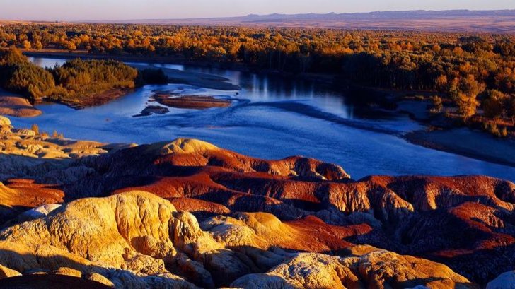 翻越天山到奎屯後,蘭斌開車送劉魯豫秘書長去烏魯木齊接朋友,我和黃建國、司機張允峰、助理程小克繼續北上到了布爾津縣。布爾津有一個著名的景點「五彩灘」,它位於新疆北端,屬阿勒泰地區,地處我國唯一注入北冰洋的額爾齊斯河北岸(海拔480米),距布爾津縣城24公里,也是前往哈巴河縣與喀納斯的必經之路。它毗鄰碧波蕩漾的額爾齊斯河,與對岸蔥鬱青翠的河谷風光遙相輝映,可謂「一河隔兩岸,自有兩重天」。激猛的河流衝擊以及狂風侵蝕,形成了北岸的懸崖式雅丹地貌,河岸岩層抗風化能力強弱不一,輪廓便會參差不齊,而岩石含有礦物質的不同,又幻化出種種異彩,因此得名「五彩灘」。