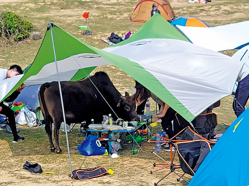 20多隻無草可食的黃牛散布在弓背山頭各處。部分黃牛遊走在遊客和露營者之間,不斷伸長條頸向遊人討食,有的更直闖帳篷,逐個帳篷搜尋,見有膠袋就探頭取食物,有遊人來不及收回食物,便即時被牛隻一口咬走吃掉。找不到食物的牛隻,在各個帳篷間轉來轉去,賴死不走。也有牛隻飢不擇食,把搶來的公仔麵連包裝袋一併吞下,最後因無法咬爛膠袋而吐出。