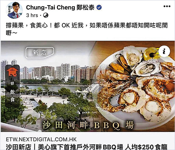 黃絲嘅心頭好《蘋果日報》日前幫美心賣廣告,推介佢旗下嘅戶外BBQ場,大讚食物有驚喜、地方又整潔。成日俾黃絲同路人雙標針對嘅蟲泰立即抓住時機,噚日就轉發《蘋果日報》個報道,仲陰陽怪氣咁話:「撐《蘋果》,食美心!都OK近我,如果唔係《蘋果》都唔知開咗呢間嘢。」仲要攞出蘋果條美心戶外BBQ場報道片,片尾嘅一個寫住「自由……我們不會認命!」嘅畫面諷刺佢哋。