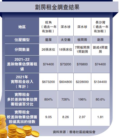 去年爆發疫情開始,《大公報》推出專題系列,報道劏房戶各種辛酸。而香港社區組織協會早前在深水埗、油尖旺區內,隨機抽查各類不適切居所,發現業主或中介將單位劏開出租,租金收益可高於其估計租值9.05倍,最低亦有1.37倍。籠屋的回報最驚人,其中旺角一處有26個床位的籠屋,租值僅七萬多元,逆市加租後,實際租金收入高達67萬元。(詳見表)