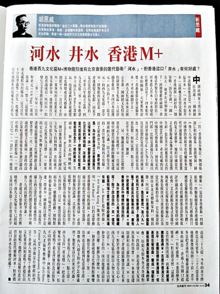(大公報記者 苑向芹)就近日M+博物館的藏品風波,香港進念二十面體聯合藝術總監胡恩威於《亞洲周刊》撰文透露,西九文化區有兩位人物好重要,一位是M+董事局的主席羅仲榮;另一位則是西九管理局董事局副主席夏佳理。