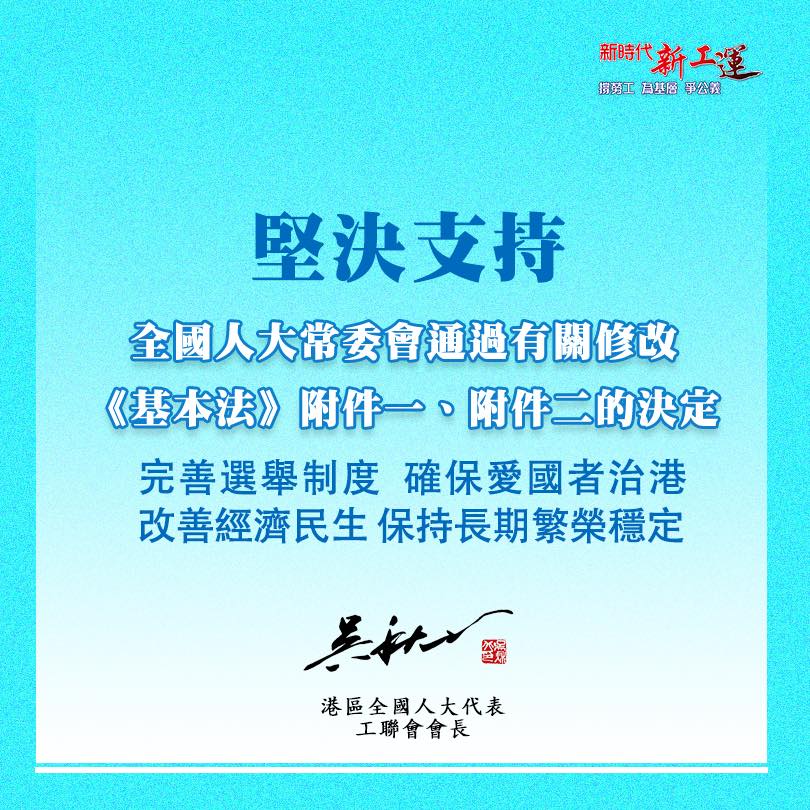 作為「愛國者」為主體的管治隊伍中,最堅定、穩定,必不可少的重要參與者,工聯會務必督促、協助政府,儘快完成本地立法工作。為未來發展,打好基礎。