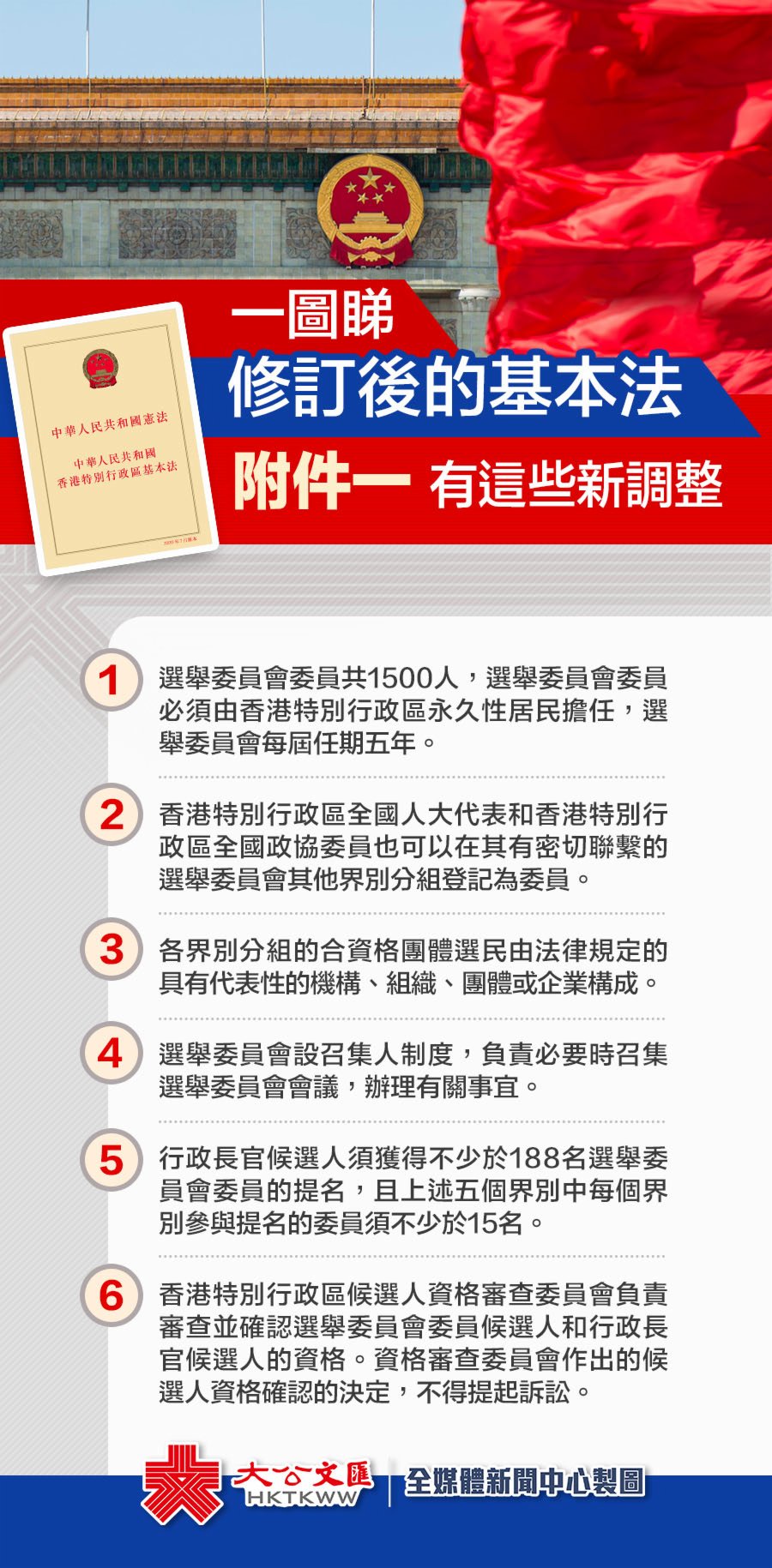 大公文匯全媒體報道,修訂後的基本法附件一全文今日(30日)公布,當中列明選舉委員會委員共1500人,由五個界別人士組成。行政長官候選人須獲得不少於188名選舉委員會委員的提名,且上述五個界別中每個界別參與提名的委員須不少於15名。每名選委會委員只可提出一名候選人。基本法附件一還有哪些新修訂?快來睇下!