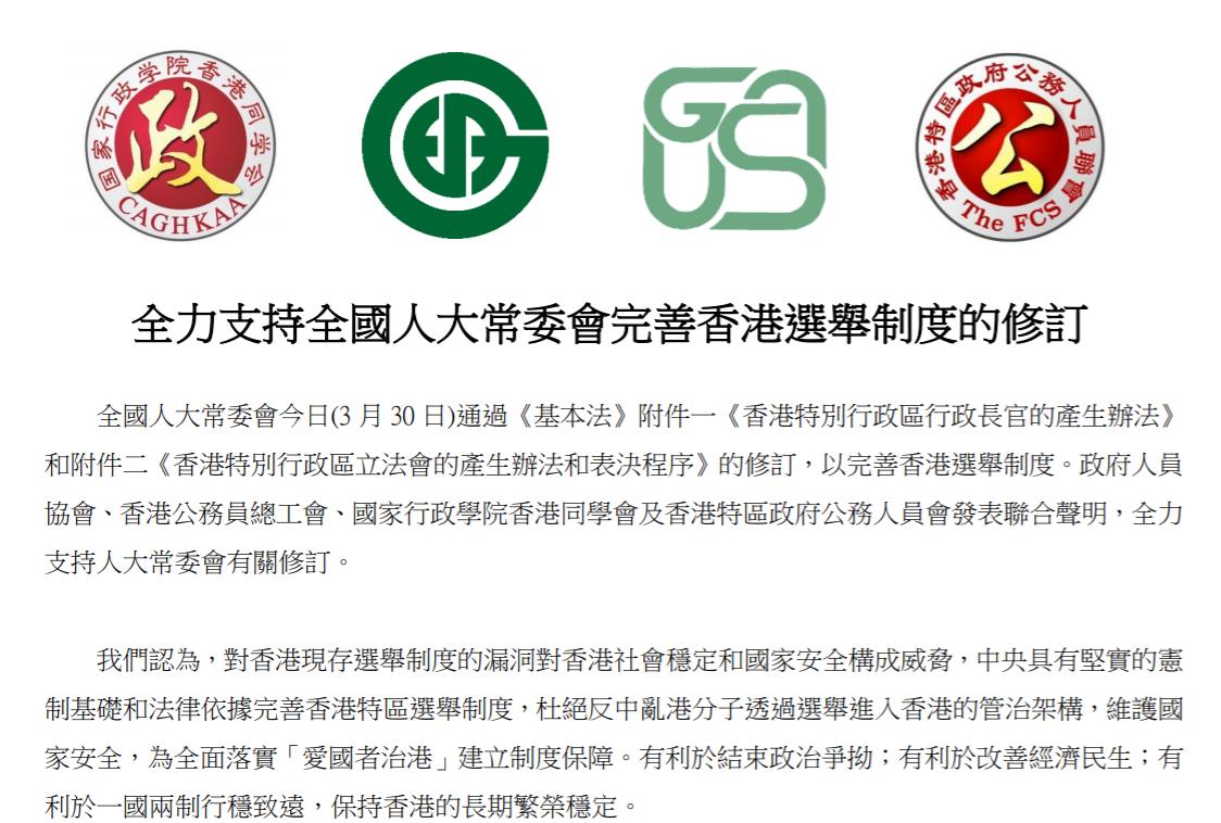 聲明又指,公務員作為特區管治力量的主體,肩負貫徹落實「一國兩制」方針的責任和使命,應帶頭支持全國人大常委會有關修訂,全力配合相關跟進工作。聲明呼籲公務員同事盡職履責,支持特區政府依法施政,同心同德為市民謀福祉,為香港長期繁榮穩定及落實「愛國者治港」作出貢獻。
