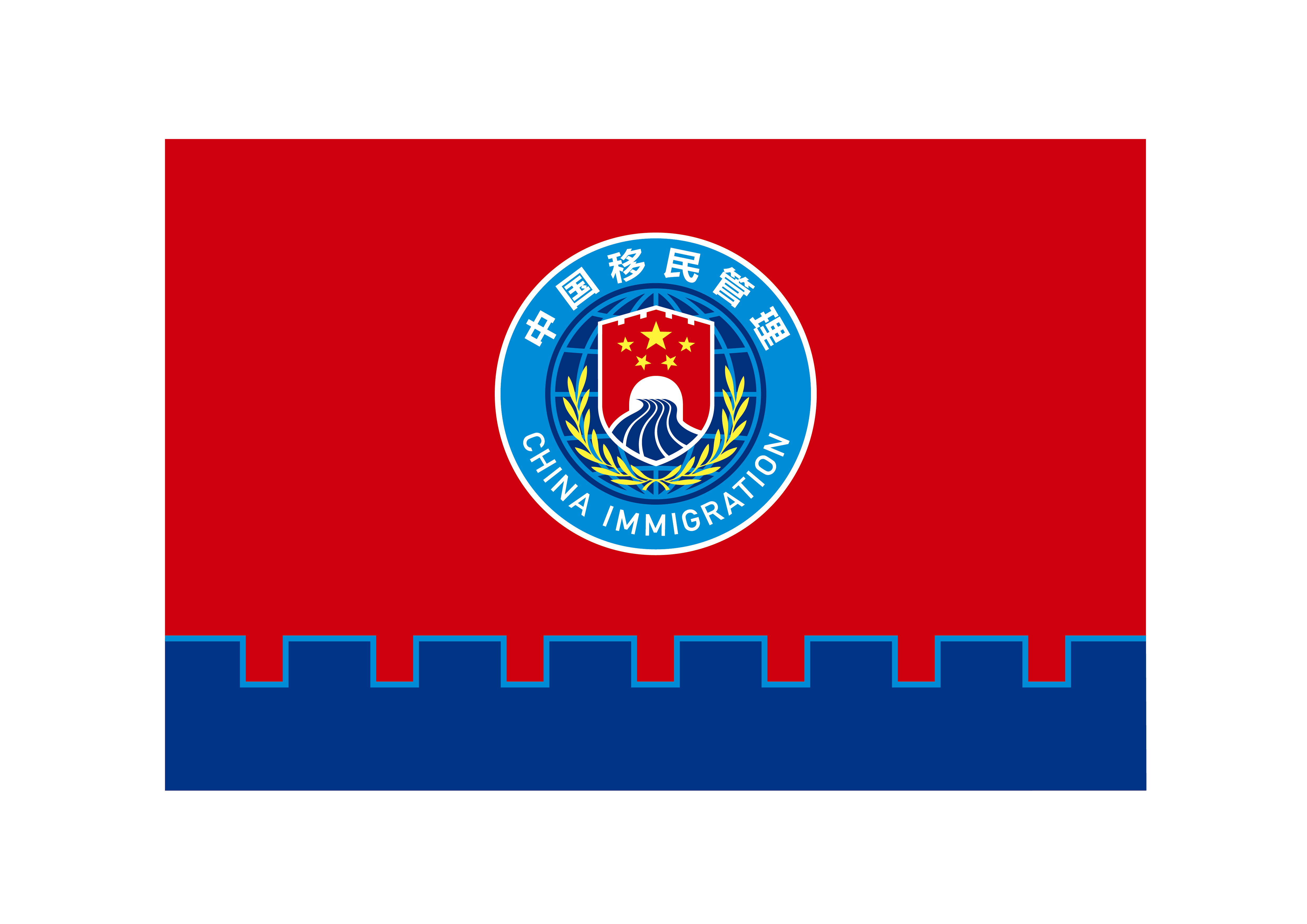 中國移民管理標誌則由五星、國門、長城關隘、地球、橄欖枝以及「中國移民管理」中英文字樣等元素構成。中心圖案為盾牌造型,上部為長城關隘輪廓,以國旗紅為底色,綴金五星,下部為五條藍色的通道,寓意開放的國門連通世界,象徵移民管理機構依法履行職責,維護國家主權、安全和發展利益,保障經濟社會發展,保護出入境人員合法權益。金色橄欖枝和藍色地球背景,象徵移民管理機構服務對外開放,促進中外交往交流,推動構建人類命運共同體。