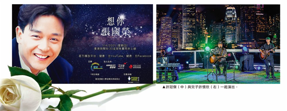 (大公報記者 陳惠芳)不經不覺,張國榮離世已18年。「想你 張國榮」音樂會昨晚在全港七大電子媒體以及全球超過80個平台同步上線,壓軸出場的許冠傑獻唱《有誰共鳴》,將最後一句歌詞「夜闌靜,問有誰共鳴」改為「夜闌靜,願哥哥可感應」,表達對張國榮的思念。