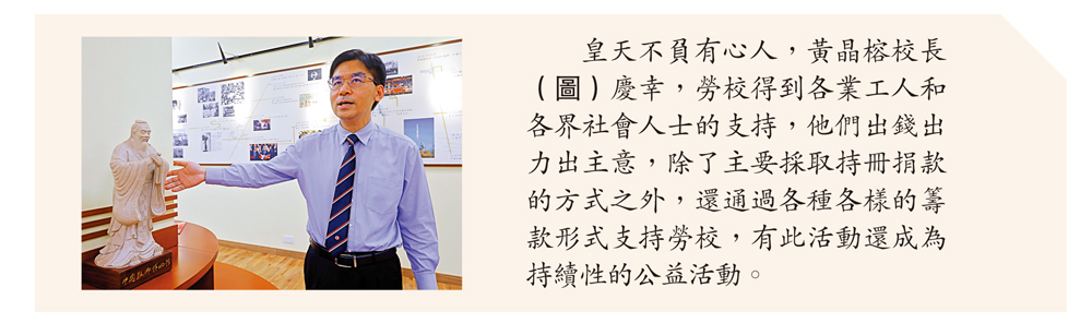 皇天不負有心人,黃晶榕慶幸,勞校得到各業工人和各界社會人士的支持,他們出錢出力出主意,除了主要採取持冊捐款的方式之外,還通過各種各樣的籌款形式支持勞校,有此活動還成為持續性的公益活動。他娓娓細數這些籌款活動,包括1950年為籌建新校舍而舉辦的賣花籌款、設義賣籌款攤位、1951年的美術義展、1953年的足球義賽及大大小小的義演,都為當時經濟困難的勞校帶來了甘泉。港英當局直到1991年,終於將包括勞校在內的數所愛國學校列為資助學校。黃校長直言,廣大香港愛國同胞成就了勞校。