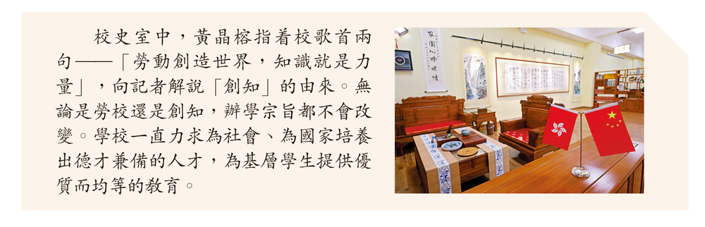 「不論要花多少資金,國民教育要繼續出彩地辦下去。」在黃晶榕的推動下,創知中學在去年設立了中華文化暨憲法教室,於初中階段的生活與社會科教授憲法、基本法及國安教育內容,為學生推動全方位國情教育,培養正確的國民身份認同。
