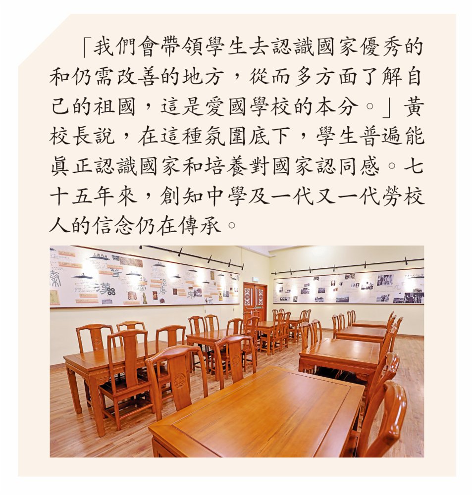 「我們會帶領學生去認識國家優秀的和仍需改善的地方,從而多方面了解自己的祖國,這是愛國學校的本分。」在這種氛圍底下,學生普遍能真正認識國家和培養對國家認同感。七十五年來,創知中學及一代又一代勞校人的信念仍在傳承。