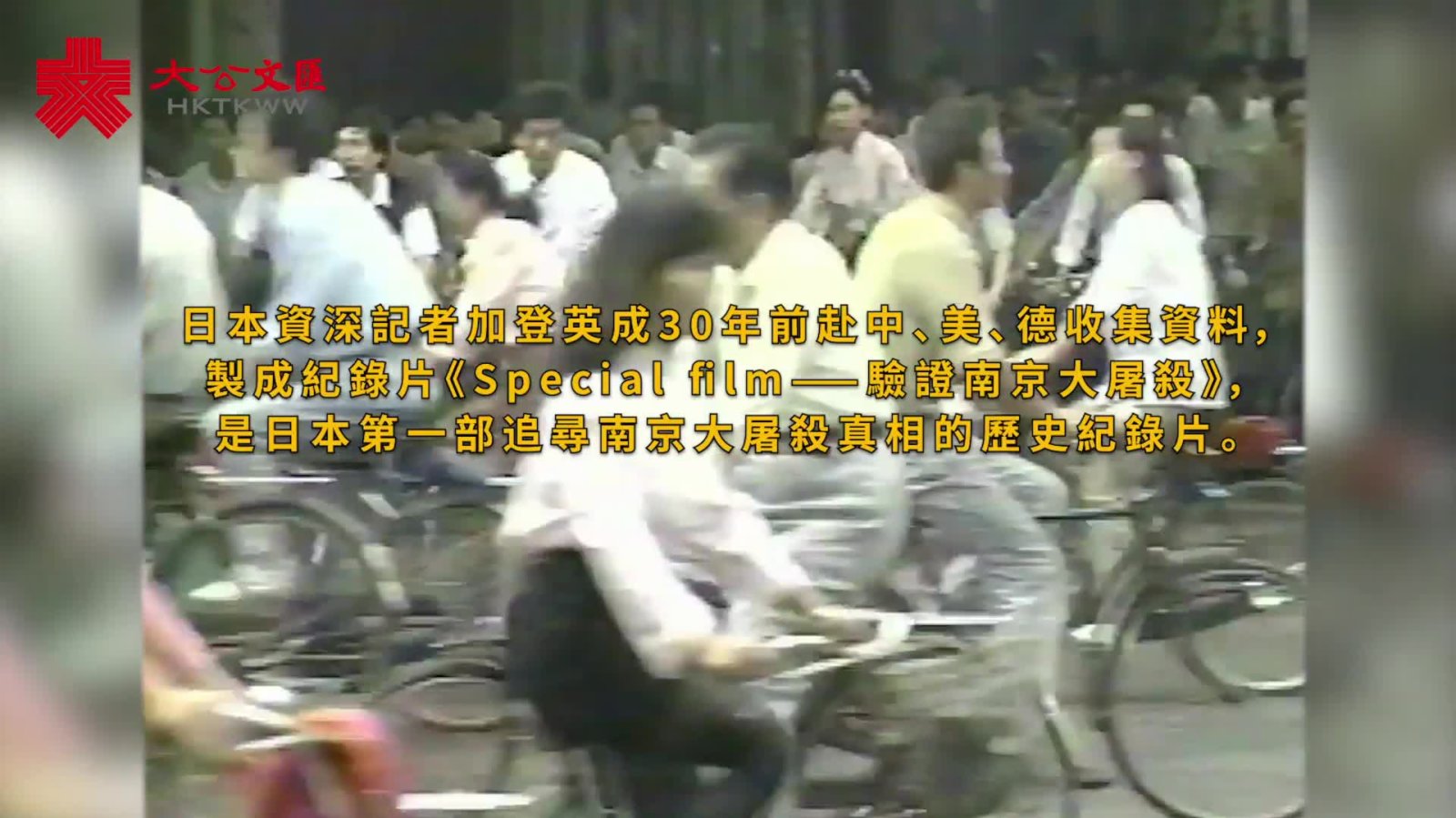 大公文匯全媒體記者陳旻南京報道:今年62歲的日本資深記者加登英成,30年前曾赴中國、美國、德國收集資料,製作了紀錄片《Special film——驗證南京大屠殺》。影片大量使用了美國牧師約翰·馬吉秘密攝於1937年記錄南京大屠殺的影像,加登採訪到馬吉影片中記錄的受害者李秀英和夏淑琴,並拍攝下她們當年的受害現場。這是日本第一部追尋南京大屠殺歷史真相的紀錄片,1991年一經播出即成為日本各大媒體關注焦點。 美國「紀念南京大屠殺受難同胞聯合會」會長姜國鎮將這部《驗證南京大屠殺》寄給大公文匯記者,今年1月,記者輾轉聯繫上加登並進行了獨家專訪。在記者與加登近50封郵件往來中,加登回憶了自己在30年前奔赴多國尋史料、製片證日寇南京暴行的特殊經歷。南京師範大學南京大屠殺研究中心主任張連紅表示,在當時日本右翼否定南京大屠殺言論甚囂塵上的背景下,這部紀錄片的播放具有特別重要的意義。