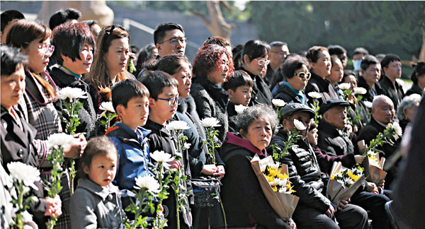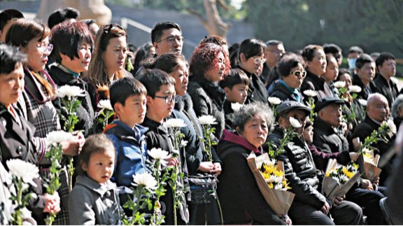 臨近清明前,高齡的倖存者陸續在家人陪伴下到紀念館的「哭牆」前進行祭奠。一朵朵菊花承載着倖存者們對親人的沉重哀思。