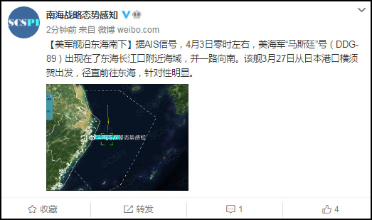 《環球時報》昨晚報道,據日本防衛省的公告稱,前天(4月3日)上午8點左右,日本海上自衛隊在長崎縣男女群島西南約470公里的海域,發現六艘中國海軍艦艇向東南方向航行,分別為遼寧號航母,一艘仁海級導彈驅逐艦,兩艘旅洋III級導彈驅逐艦,一艘護衛艦,以及一艘作戰支援艦。