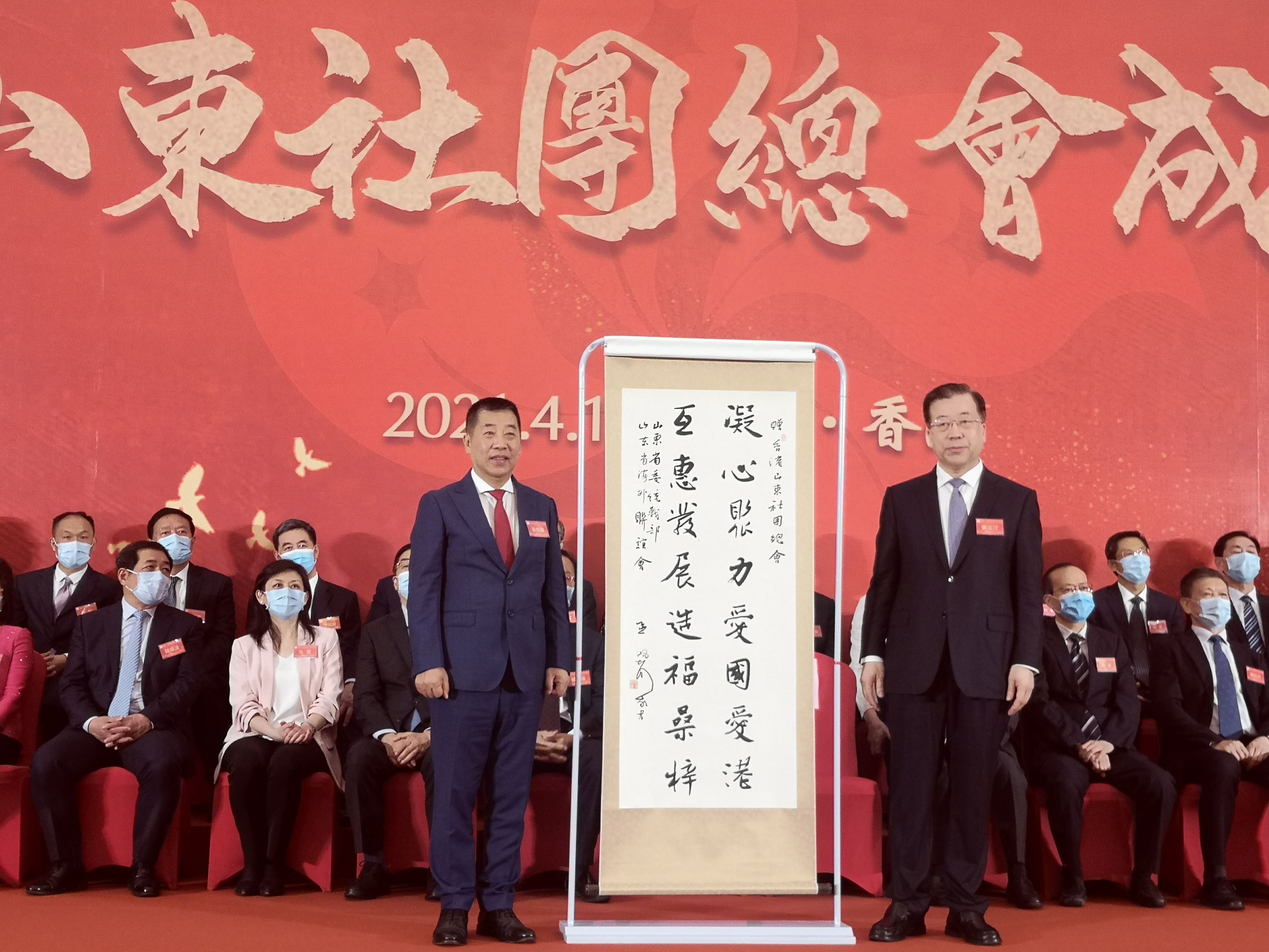 山東省委統戰部部長張江汀在致辭中表示,衷心希望社團總會更高地舉起愛國主義旗幟,團結帶領廣大會員鄉親,堅決貫徹「一國兩制」方針和基本法,積極參與香港社會的政治事務,以身作則做好中央涉港政策宣傳,旗幟鮮明與破壞祖國統一的行為作鬥爭,為維護香港繁榮穩定貢獻更大力量;同時,他希望社團總會廣泛邀請香港各階層、各界別的代表人士到山東參訪,探索建立魯港經濟、文化、社會深層次常態化交流機制,持續為山東的發展聚人氣、聚人脈、聚人心。