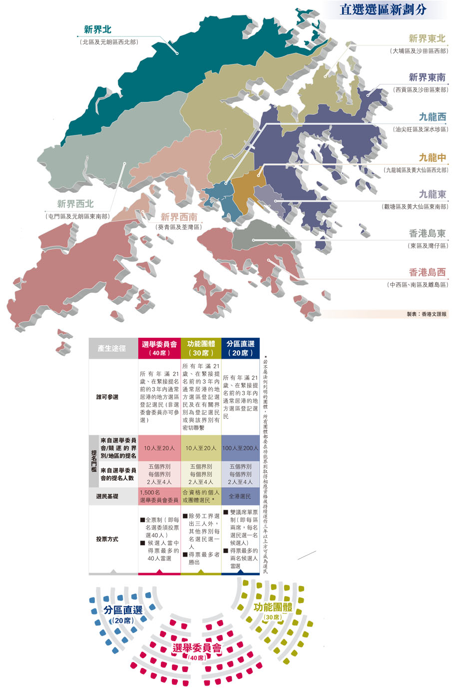 (香港文匯報記者 倪思言)特區政府昨日公布《2021年完善選舉制度(綜合修訂)條例草案》,立法會選舉議席由原有的70席增至90席,具體議席分布為選委會佔40席、功能界別佔30席,地區直選議為20席。針對20個地區選舉產生的議席,草案建議以各區人口基數及不割裂選區為基礎,同時考慮到人口基數,將原先的5個地方選區重新劃分為10區,每區有約60萬至80萬名選民,新界分為5區、九龍3區、港島2區,每區採取雙議席單票制各選出兩名立法會議員。