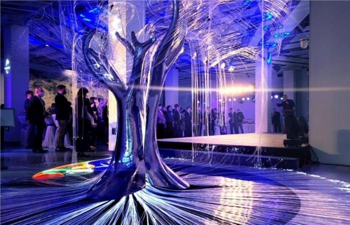 這棵詩意朦朧、火樹銀花的光纖樹,樹幹疑似錯誤| 建議:幹(疑似错误)採用不鏽鋼塑造,樹冠是像雲一樣的光纖組成的,網狀結構飄在樹頂之上,形成了一種既真實又夢幻的效果。樹的左右兩側各有兩台心跳檢測儀,可以檢測到觀眾心跳脈搏的頻率,然後將這種脈搏的頻率轉化成光的頻閃。