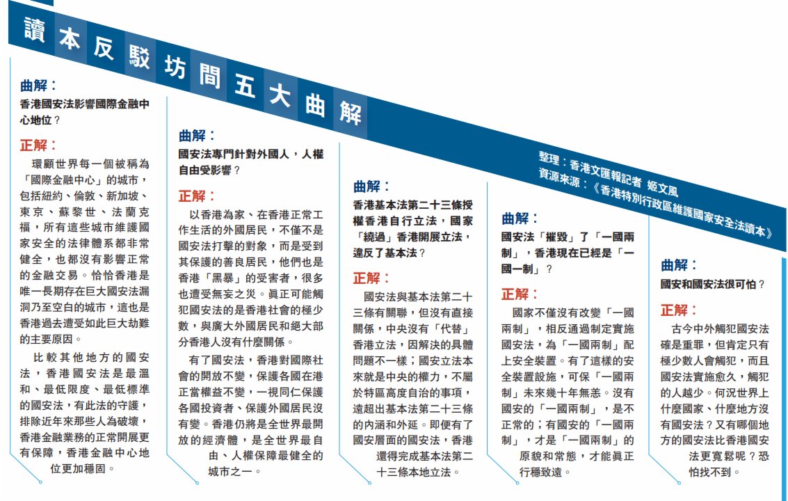 其中一項常見謬論是所謂「國安法影響香港國際金融中心地位」。讀本強調,環顧世界每一個被稱為「國際金融中心」的城市,包括紐約、倫敦、新加坡等國家城市,均有一套健全、嚴格的維護國安的法律體系,絲毫沒有影響正常的金融交易;反觀香港國安法是最溫和、最低限度、最低標準的國安法,有此法的守護,香港金融業務的正常開展更有保障,香港金融中心地位更加穩固。