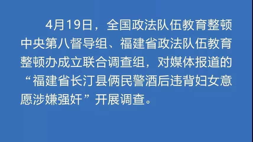 大文新聞網報道,4月19日,福建省政法隊伍教育整頓辦通報稱:由全國政法隊伍教育整頓第八督導組、福建省政法隊伍教育整頓辦成立聯合調查組,對媒體報道的「福建省長汀縣倆民警酒後違背婦女意願涉嫌強姦」開展調查。