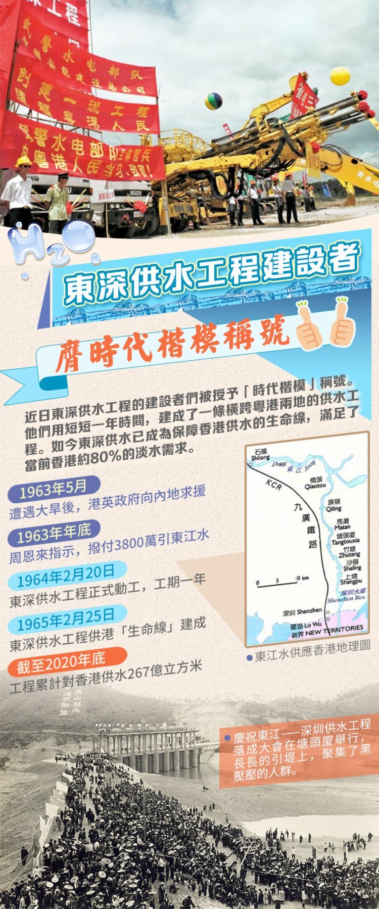 東江—深圳供水工程(簡稱「東深供水工程」),是黨中央為解決香港同胞飲水困難而興建的跨流域大型調水工程。上世紀60年代,來自珠三角地區的上萬名建設者,響應國家號召,心繫香港同胞,不懼艱難困苦,克服重重挑戰,一鍬一筐、肩挑背扛,開山劈嶺、修堤築壩,以「要高山低頭、令江水倒流」的壯志豪情,短短一年時間,建成了全長83公里的宏大供水工程,極大緩解了香港的用水困難。50餘年來,共有3萬多名工程勘探、設計、施工人員和運行維護人員參與東深供水工程建設運行。他們接力傳承,精心守護,先後四次對供水線路進行擴建、改造,使供水能力提升三十多倍、水質安全得到根本保障,惠及了沿線各地,滿足了香港約80%的淡水需求,成為保障香港供水的生命線,助力了香港經濟騰飛,保障了香港民生福祉,支撐了香港的繁榮穩定。