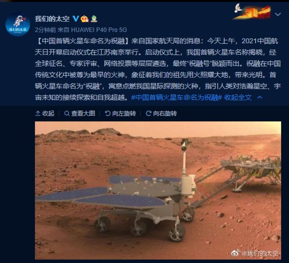 2021年1月18日,經過初評,弘毅、麒麟、哪吒、赤兔、祝融、求索、風火輪、追夢、天行、星火,作為中國第一輛火星車全球徵名活動入圍前10強名稱。