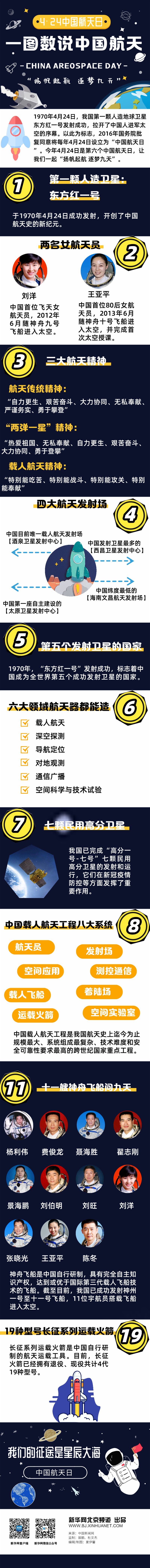 1970年4月24日,中國自主研製的第一顆人造地球衛星「東方紅一號」成功發射,拉開了中華民族探索浩瀚太空的序幕。以此為標志,2016年國務院批復同意將每年4月24日設立為「中國航天日」。今天(4月24日)是第六個「中國航天日」,新華網策劃懶人包,一圖讓你了解中國航天知識。請看下圖: