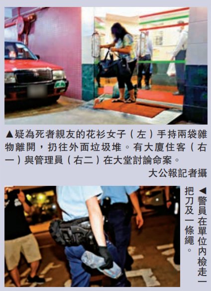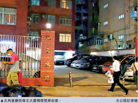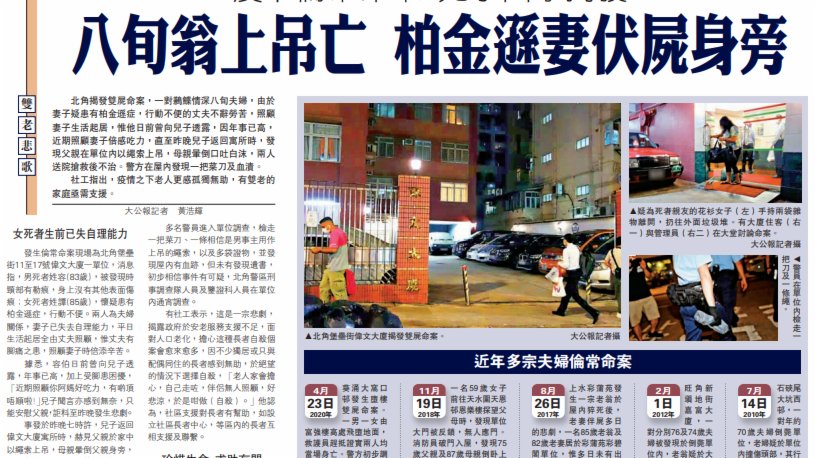 (大公報記者 黃浩輝)北角揭發雙屍命案,一對鶼鰈情深八旬夫婦,由於妻子疑患有柏金遜症,行動不便的丈夫不辭勞苦,照顧妻子生活起居,惟他日前曾向兒子透露,因年事已高,近期照顧妻子倍感吃力,直至昨晚兒子返回寓所時,發現父親在單位內以繩索上吊,母親暈倒口吐白沫,兩人送院搶救後不治。警方在屋內發現一把菜刀及血漬。