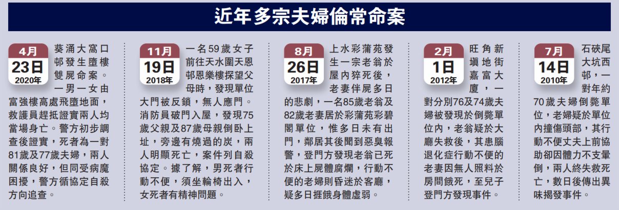 據悉,容伯日前曾向兒子透露,年事已高,加上受腳患困擾,「近期照顧你阿媽好吃力,有啲頂唔順啦!」兒子聞言亦感到無奈,只能安慰父親,詎料至昨晚發生悲劇。