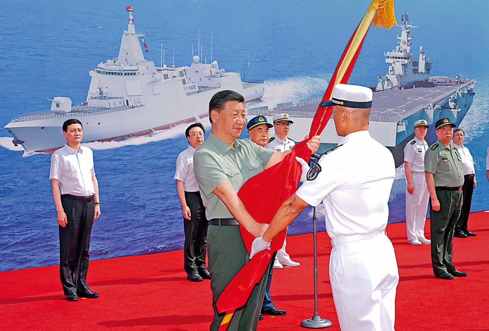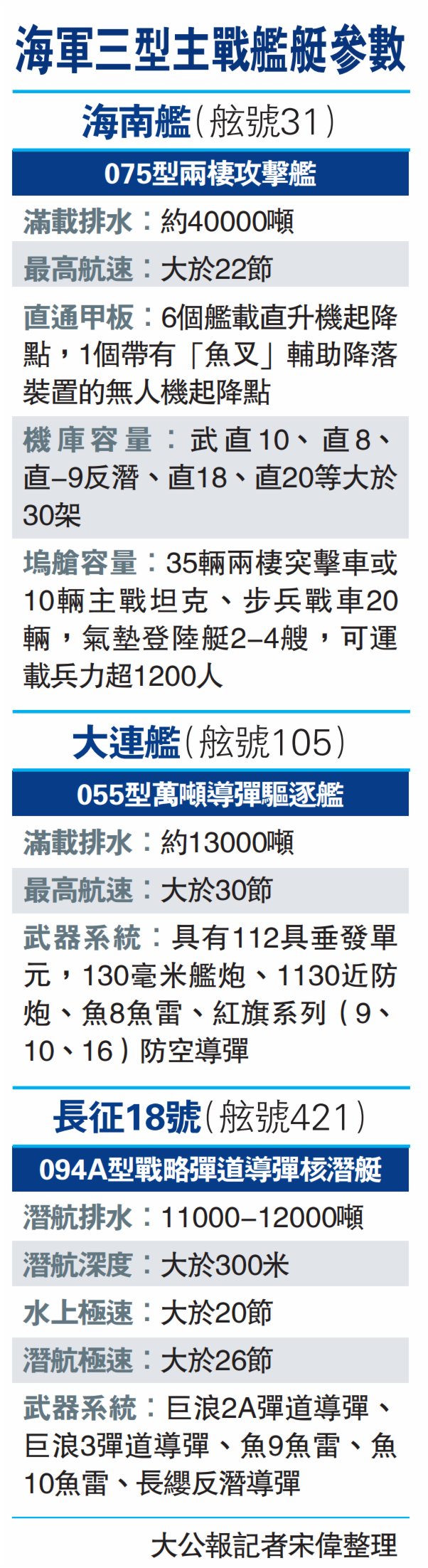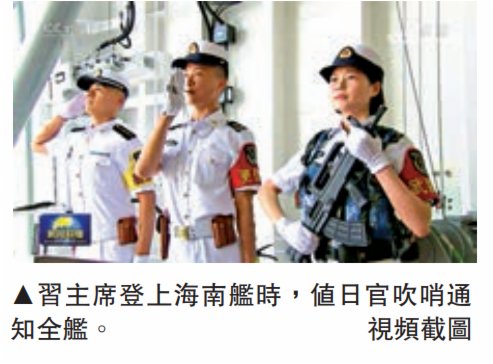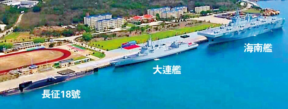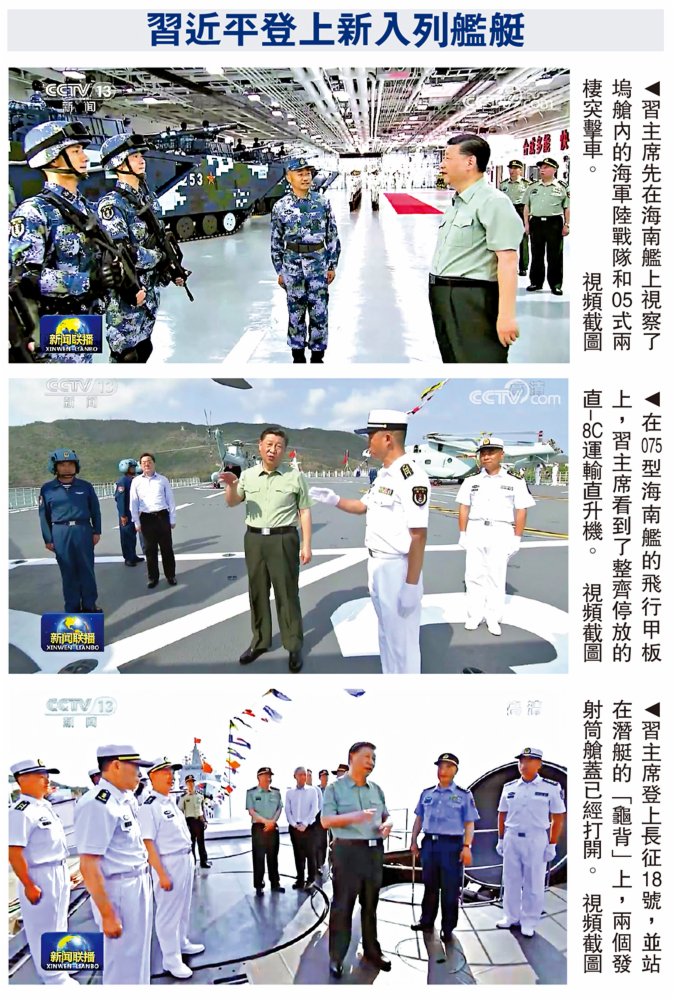 大公報綜合新華社、央視新聞報道:中國海軍三型主戰艦艇──長征18號艇、大連艦、海南艦23日在海南三亞某軍港集中交接入列。中共中央總書記、國家主席、中央軍委主席習近平出席交接入列活動,向三型艦艇的艦艇長、政治委員分別授予八一軍旗、命名證書。隨後,習近平登上新入列艦艇,檢閱艦艇儀仗隊,登上戰略核潛艇「龜背」察看有關武器裝備,走進075型兩棲攻擊艦海南艦塢艙同官兵進行交流,並在航泊日誌上鄭重簽名。