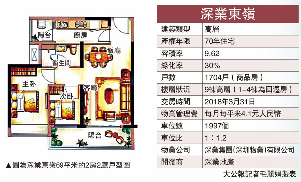 深業東嶺小區共有9棟,1至4棟為回遷房,戶型以69至72平米的兩房、88至107平米的三房、124至128平米的四房為主,5至9棟為商品房,戶型以72至126平米的2房、4房為主。小區自建有4萬平米的嶺南風情的空中花園,一樓是嶺南風情的商業街,內有餐廳、茶飲店、電影院、健身房、生活超市等一應俱全。旁邊新建的即將完工的翠園實驗學校,今年給深業東嶺帶來了一波利好,該小區二手房報價一度升到每平米9萬元(人民幣,下同)。目前,該樓盤仍有部分大戶型的回遷房在售,以126平米的四房戶型為主,單價每平米7.8萬元,但政府今年2月8日出台的指導價中,對該樓盤給出的成交參考價是每平米6.55萬元。