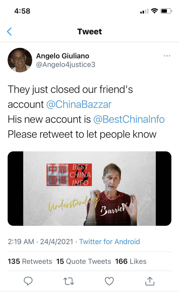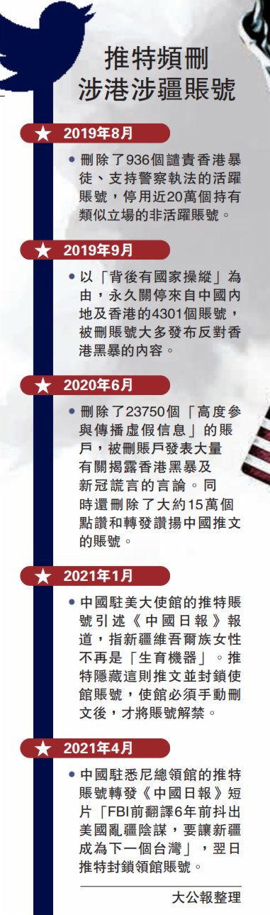(大公報記者 公孫淑)西方國家近期頻繁抹黑新疆,推特等社交巨頭充當政府打手,「封殺」那些駁斥西方捏造新疆謠言的正義之聲。前英國資深媒體人白矛(Barrie)日前接受了香港網媒點新聞採訪,談及新疆棉花、日本核廢水以及西方國家對中國的污名化等問題,並表示「中國比西方國家更民主」。採訪播出後,白矛的推特賬號被封號。推特的操作和2019年香港黑暴期間、去年疫情期間如出一轍,再次向全世界展現了西方社交媒體巨頭在網絡世界搞「霸權」和美式言論自由的虛偽本質。