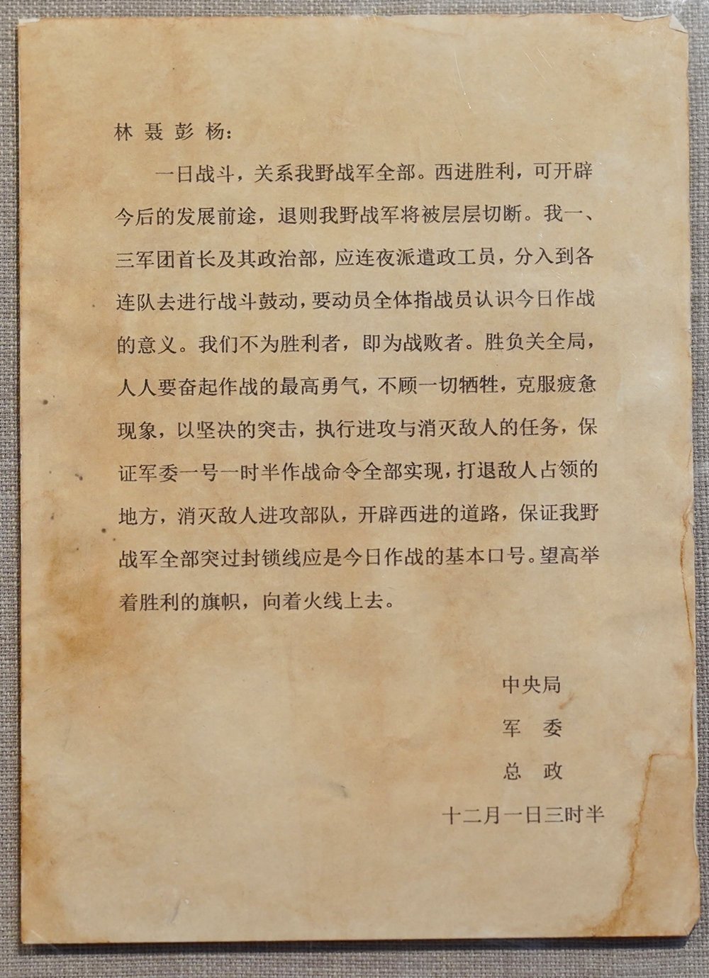 12月1日凌晨,中央紅軍在湘江南北兩翼部署的阻擊線都被壓到了絕境,生死存亡的最後時刻到了。中共中央、中革軍委、紅軍總政治部聯合發出緊急電報,下達「我們不為勝利者,即為戰敗者」「高舉着勝利的旗幟,向着火線上去」的軍令。