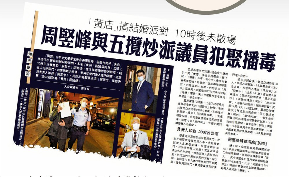 而就在上月15日即逃離香港前夕,周竪峰舉行「犯聚」結婚派對,多名畀面到賀的攬炒派區議員合共約28人都被警方當場票控。婚後不久就要背井離鄉,如今正如周竪峰自己所講,「短期內仍有一瓦遮頭三餐餬口」,淪落至此,又何必當初呢?