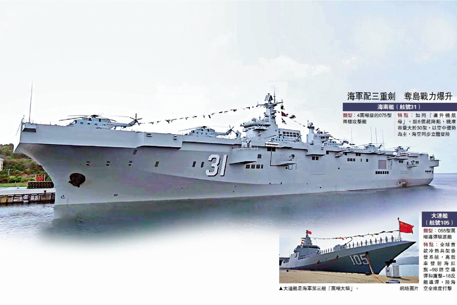 (大公報記者 馬浩亮)中國海軍第一艘075型兩棲攻擊艦海南艦入列服役。海南艦搭載直-8C、直-20、新型無人機及氣墊登陸艇、兩棲步戰車,打造依託空中力量為主、海空並進的立體化登陸作戰體系,無論從噸位還是起降能力,075型都超越了日本的「出雲」艦和韓國的「獨島」艦隊,成為亞洲最大最先進的兩棲攻擊艦。兩棲攻擊艦還可以與航母聯合組編立體化打擊群,海南艦成為海軍陸戰隊最新的頭號主戰重器和兩棲作戰群的核心,進行奪島登陸任務,戰術體系和作戰模式有了質的飛躍。